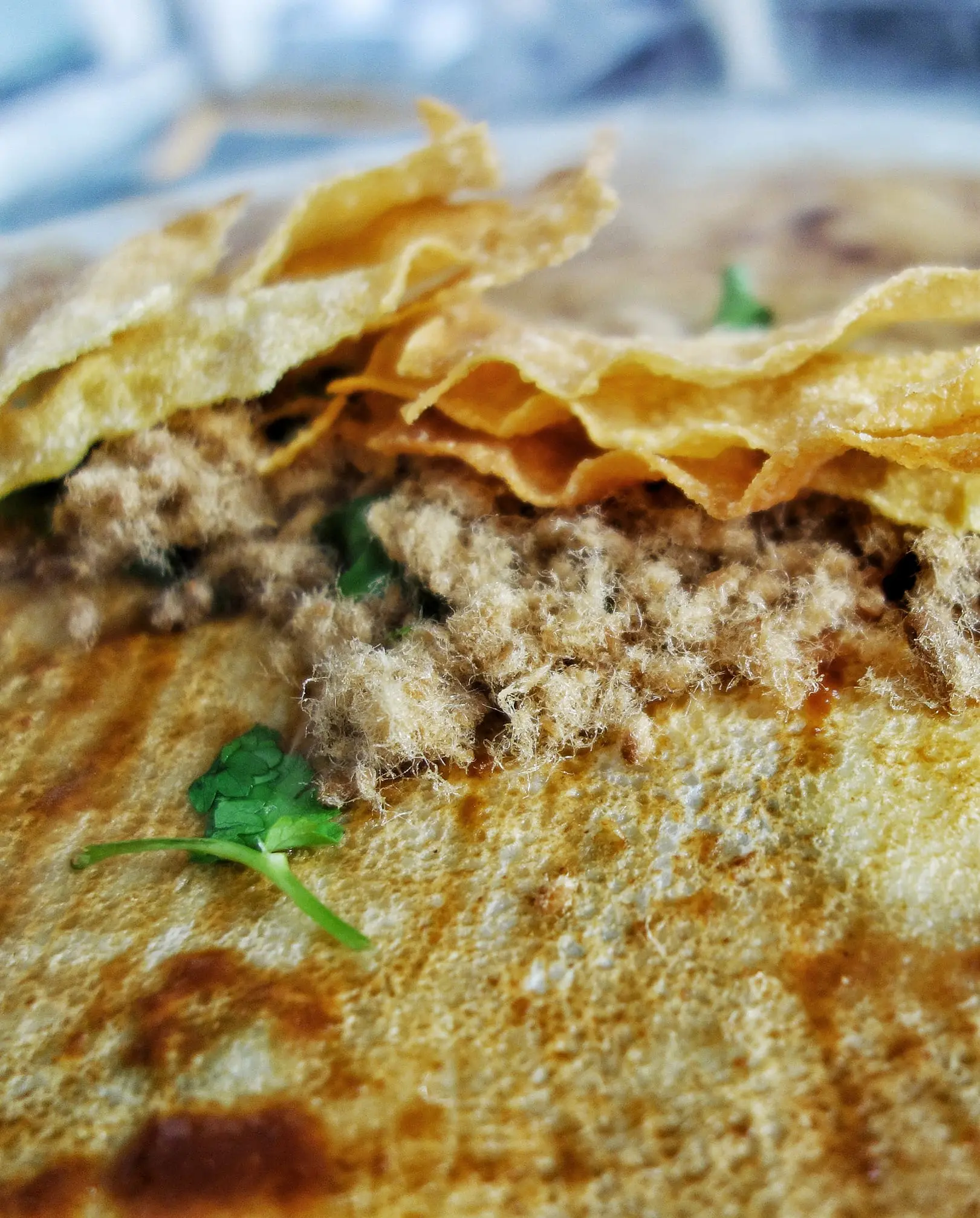 Eggs aren’t mixed in the batter either, but can be added as a choice of filling. Fried wonton skins give add a crunchy texture. Together with the soybean paste, it can sum up to create the classic jianbing product. Other filling can be added on such as bacon, cheese, avocado, and roast beef not necessarily all together.