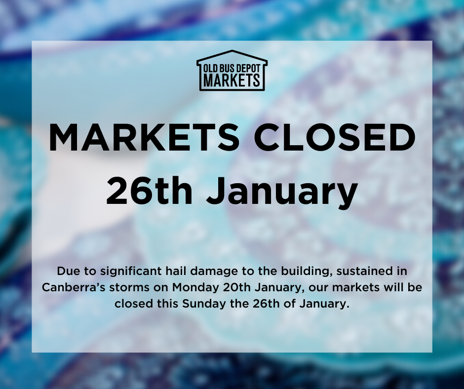 The Old Bus Depot Markets regrets to advise that the Markets will be closed this coming Sunday 26th January 2020. Due to significant hail damage to the building, sustained in Canberra’s storms on Monday 20th January, we are unable to operate. Markets’ operators are currently working with the ACT Government to rectify the damage and hope to be fully operational for the following week, Sunday 2nd February 2020.