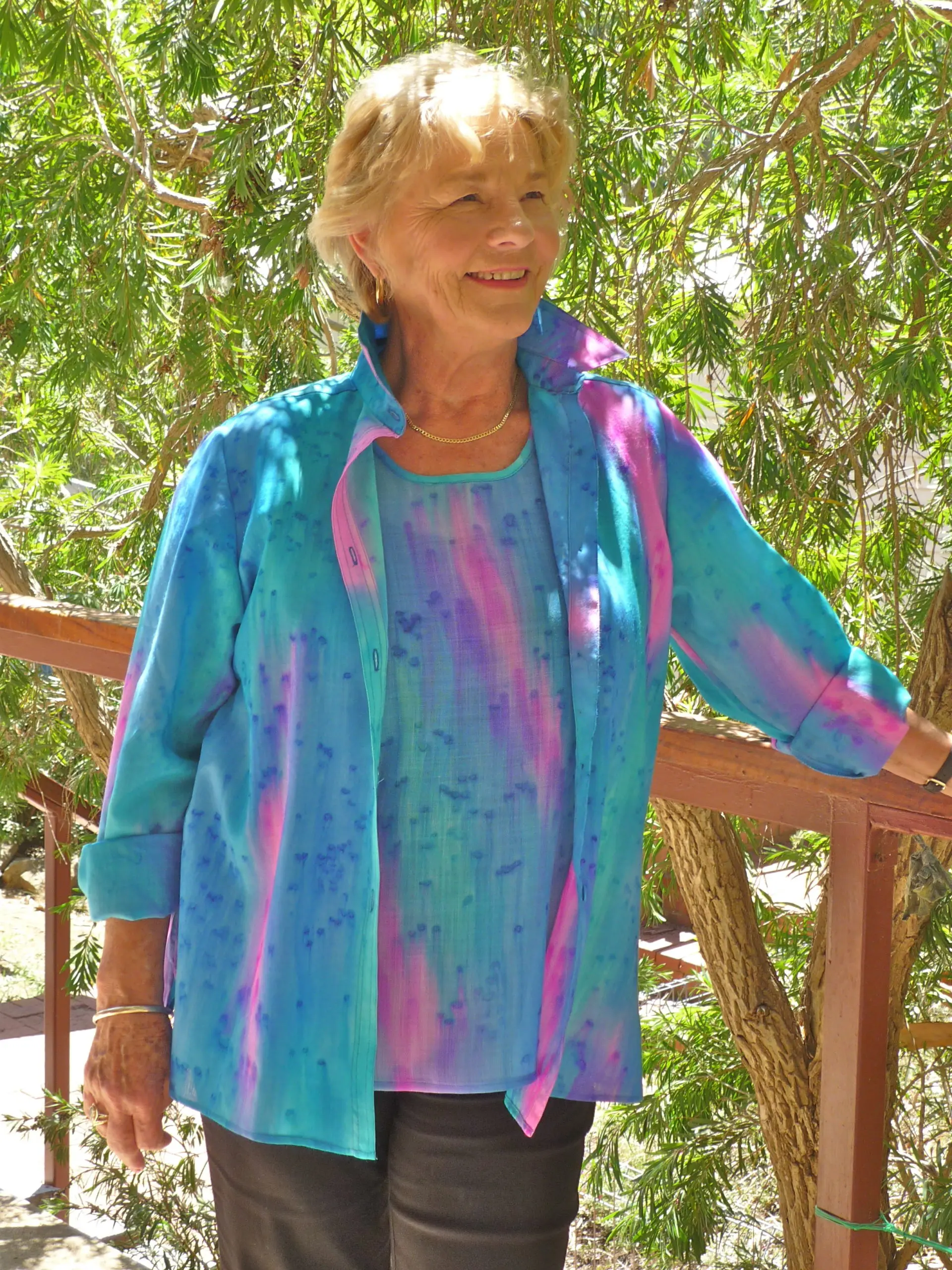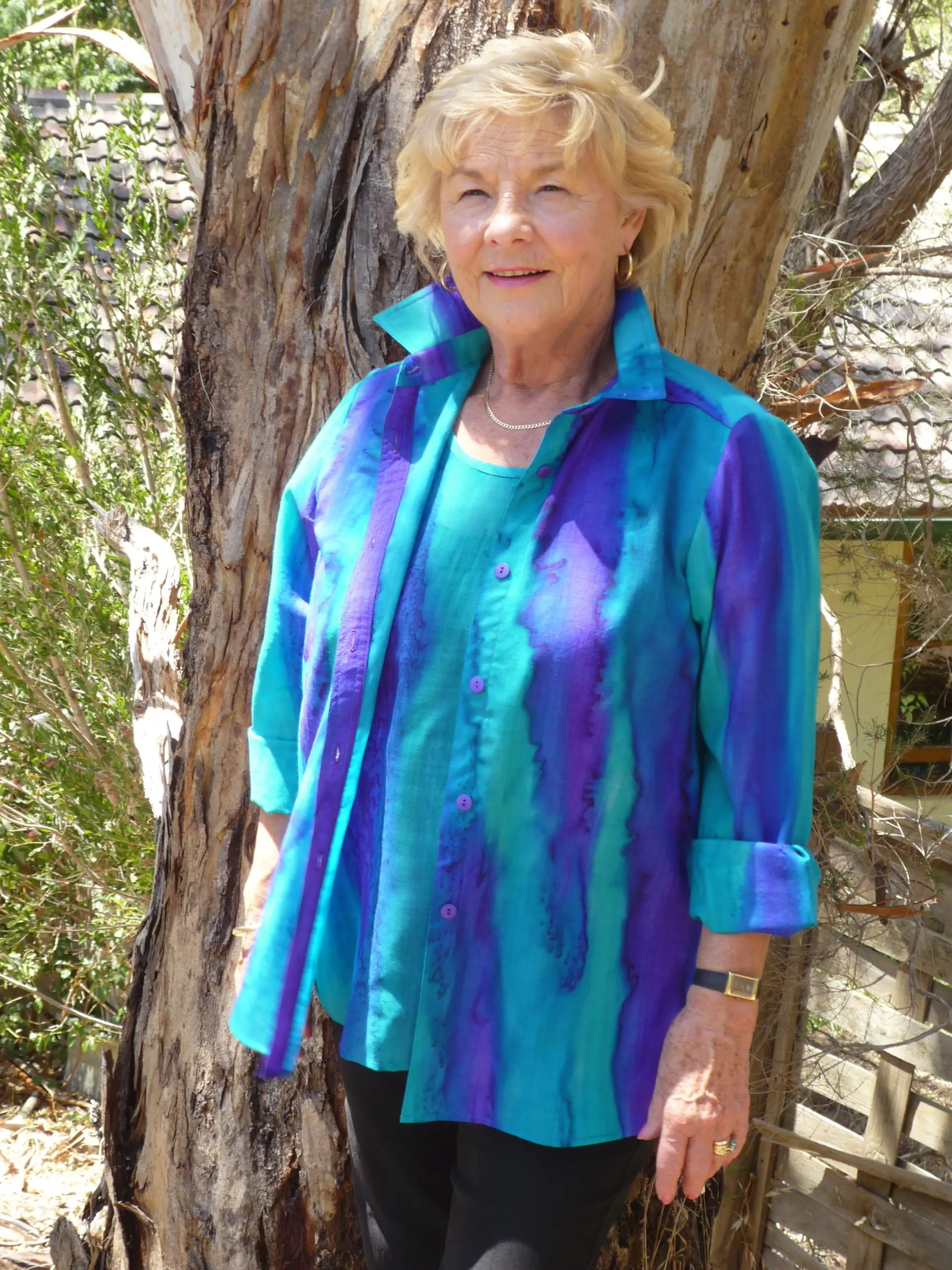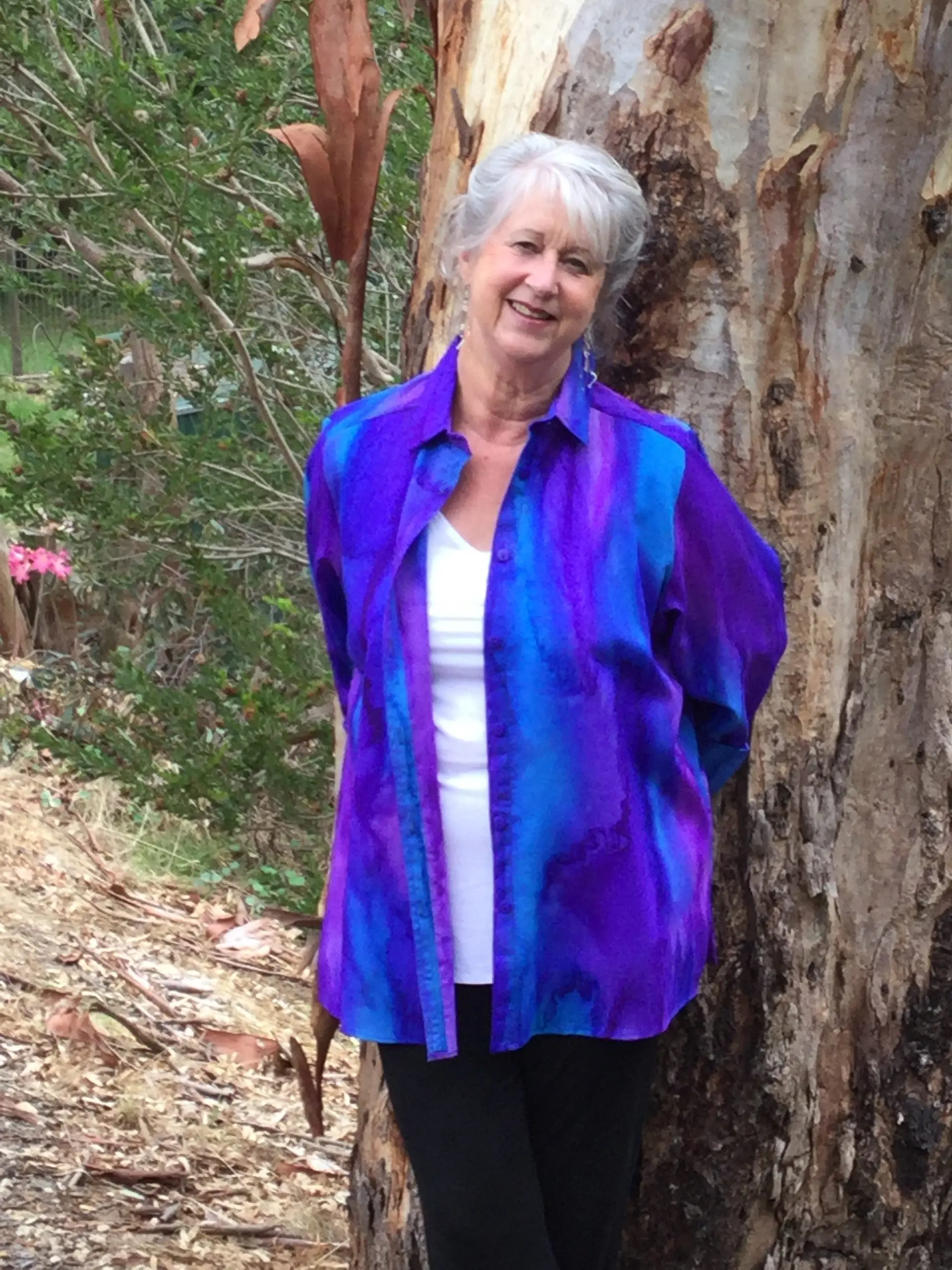 I emigrated to Australia from the UK in 1979 with no previous history, interest or experience with art. Immediately I was struck by the light and colours compared with England. I became a fabric painter by pure chance. Whilst walking past a gallery in Adelaide I saw a magnificent dress in the window, I coveted it immediately, soft greens and turquoise like the sea, beautiful material, flattering style but (of course) it was too small. However I went into the gallery to ask if by any chance there was another in my size – of course the answer was NO, it was handpainted fabric and a “one-off”. Seeing my obviously crestfallen face the lady said to me… “however I can teach you to paint your own fabric so you can make your own dress!” – I was hooked from them on. I started in the summer in the garden with cotton stretched between two tables under the patio. When winter arrived I took over the spare bedroom, tarpaulins on the floor, covers for the bed, the bottles on the dressing table. I graduated to silk, more exciting and saleable (as I was painting far more than I could possibly use). When we moved to our present home in the Adelaide Hills Jim built me an enormous studio all for myself.