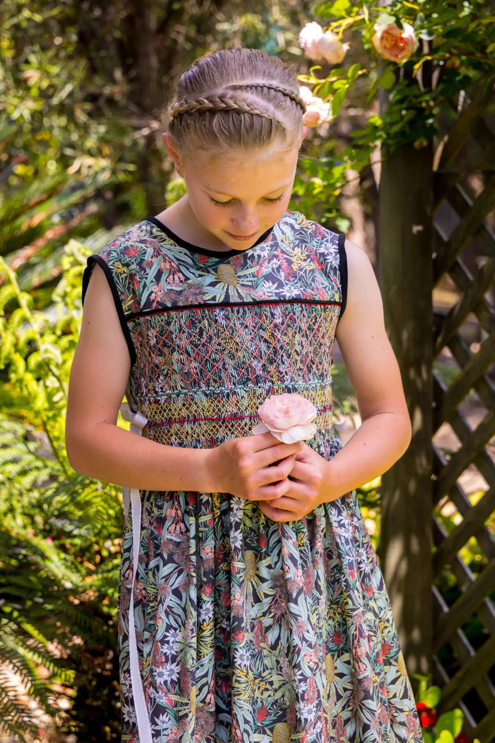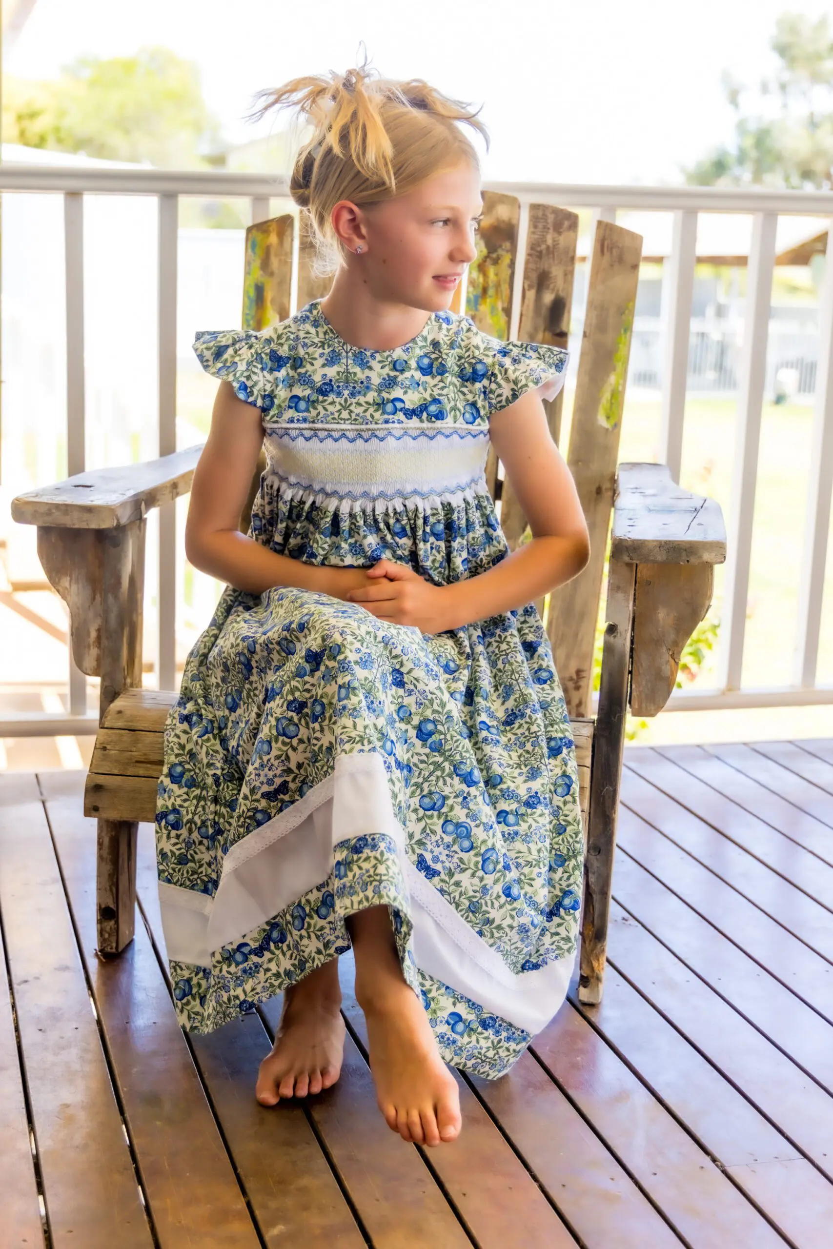 “I make hand-smocked dresses for girls up to about age 12 in a variety of styles and vibrant colourful prints, all from 100% cotton.  Some of the larger dresses would also fit petite women!  Each dress is unique: I only ever make one of each combination of design, fabric and size.