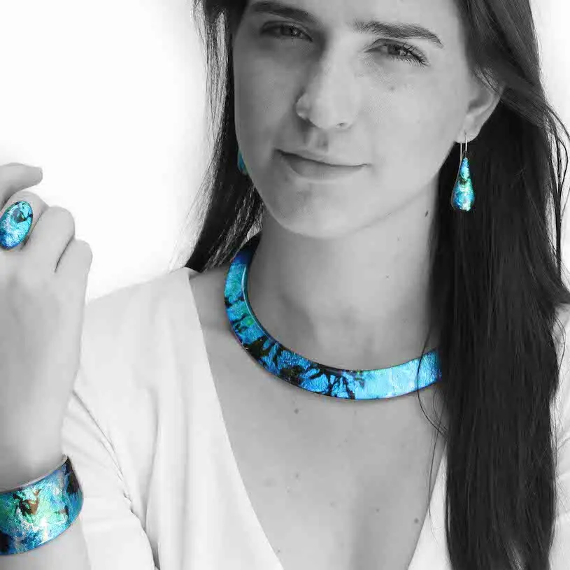 Mo Resin Jewellery was born. They showcase a contemporary unique collection of jewellery and fashion accessories (cufflinks, tie-clips and handbag holders) designed and handcrafted by French Australian artist MO. Precious gold and silver leaf are fused and suspended in translucent resin to flatter the form and delight the senses. Each one is a piece of art from the heart signed by MO.