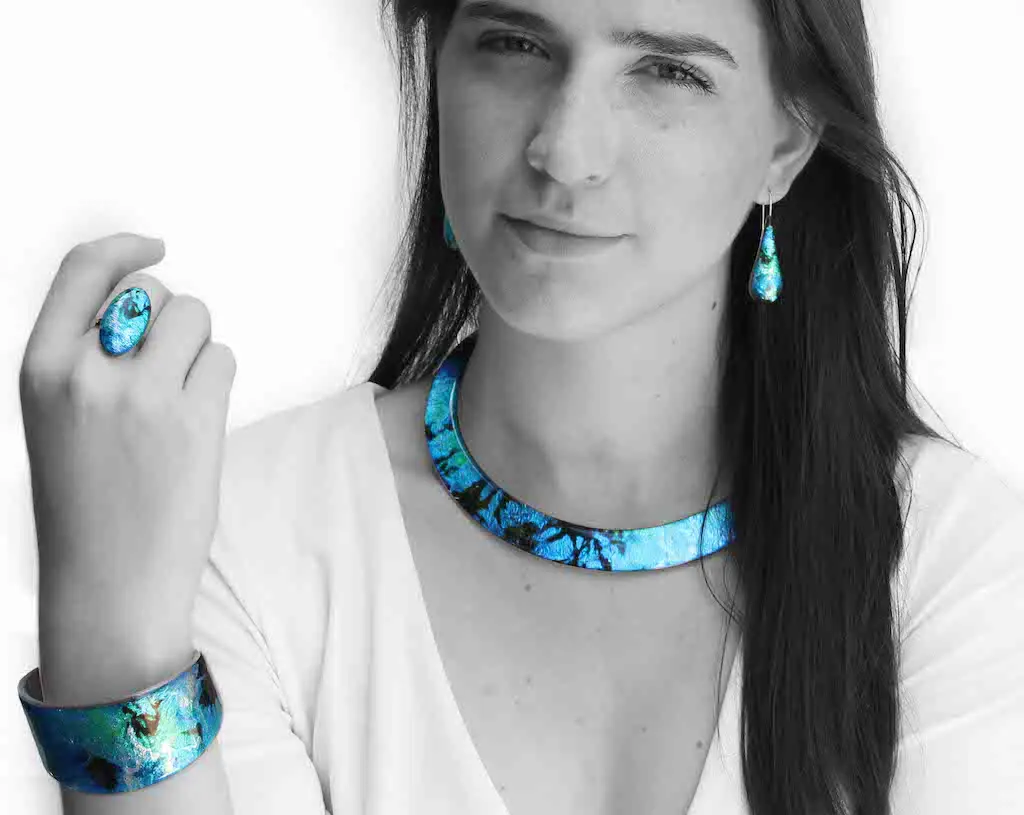 Mo Resin Jewellery was born. They showcase a contemporary unique collection of jewellery and fashion accessories (cufflinks, tie-clips and handbag holders) designed and handcrafted by French Australian artist MO. Precious gold and silver leaf are fused and suspended in translucent resin to flatter the form and delight the senses. Each one is a piece of art from the heart signed by MO.