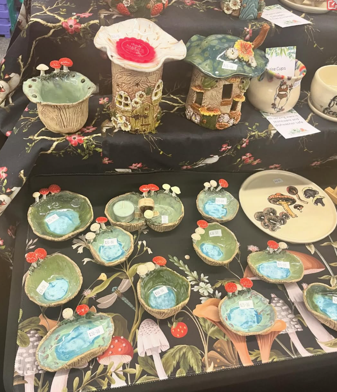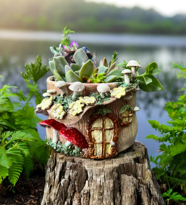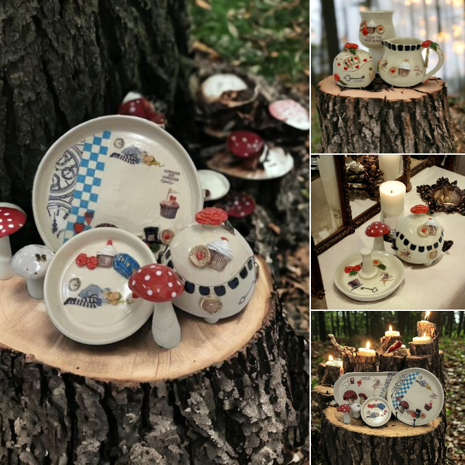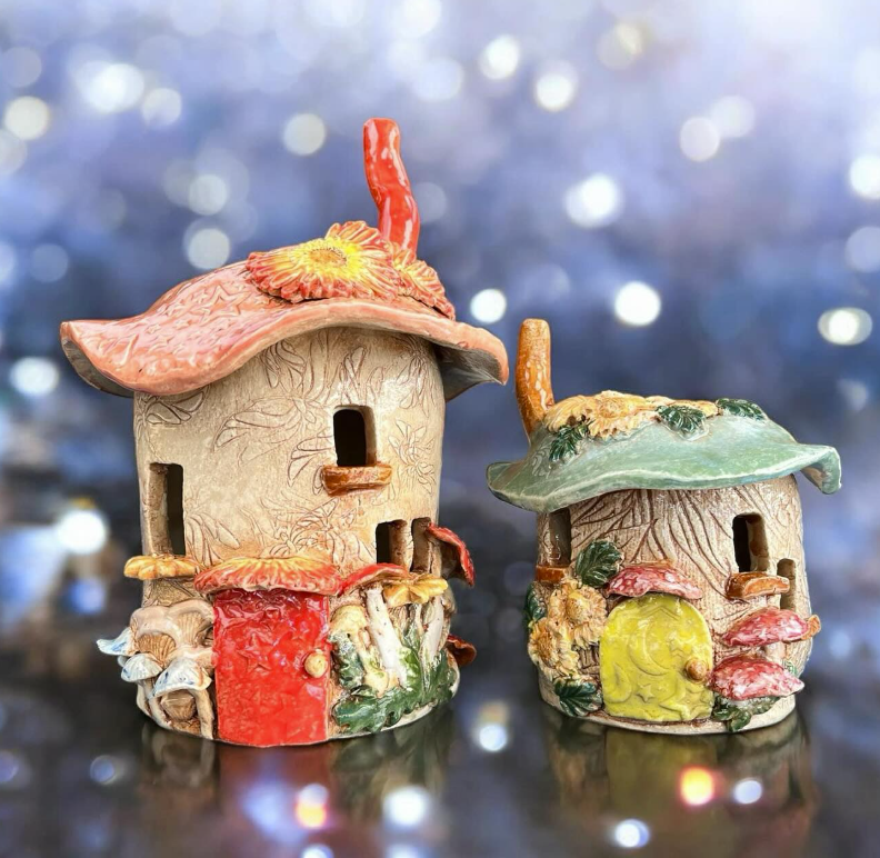 A whimsical range of hand built and wheel thrown items for the home and garden. Hand painted decorative plates, bowls, vases and cups Village on the Edge series of pottery featuring cottages A range of quirky mushrooms and enchanted pottery items